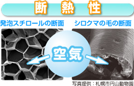 お互いに色が「白い」というだけではなく、シロクマの毛と発泡スチロールには、どちらも「空気」が入った構造から優れた断熱材(保温性・保冷性)という共通点があります。