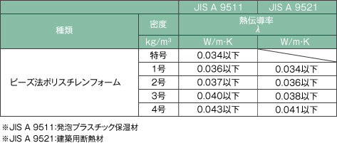 ・ビーズ法ポリスチレンフォーム3号品(JIS A 9511)の熱伝導率は上記の表 より