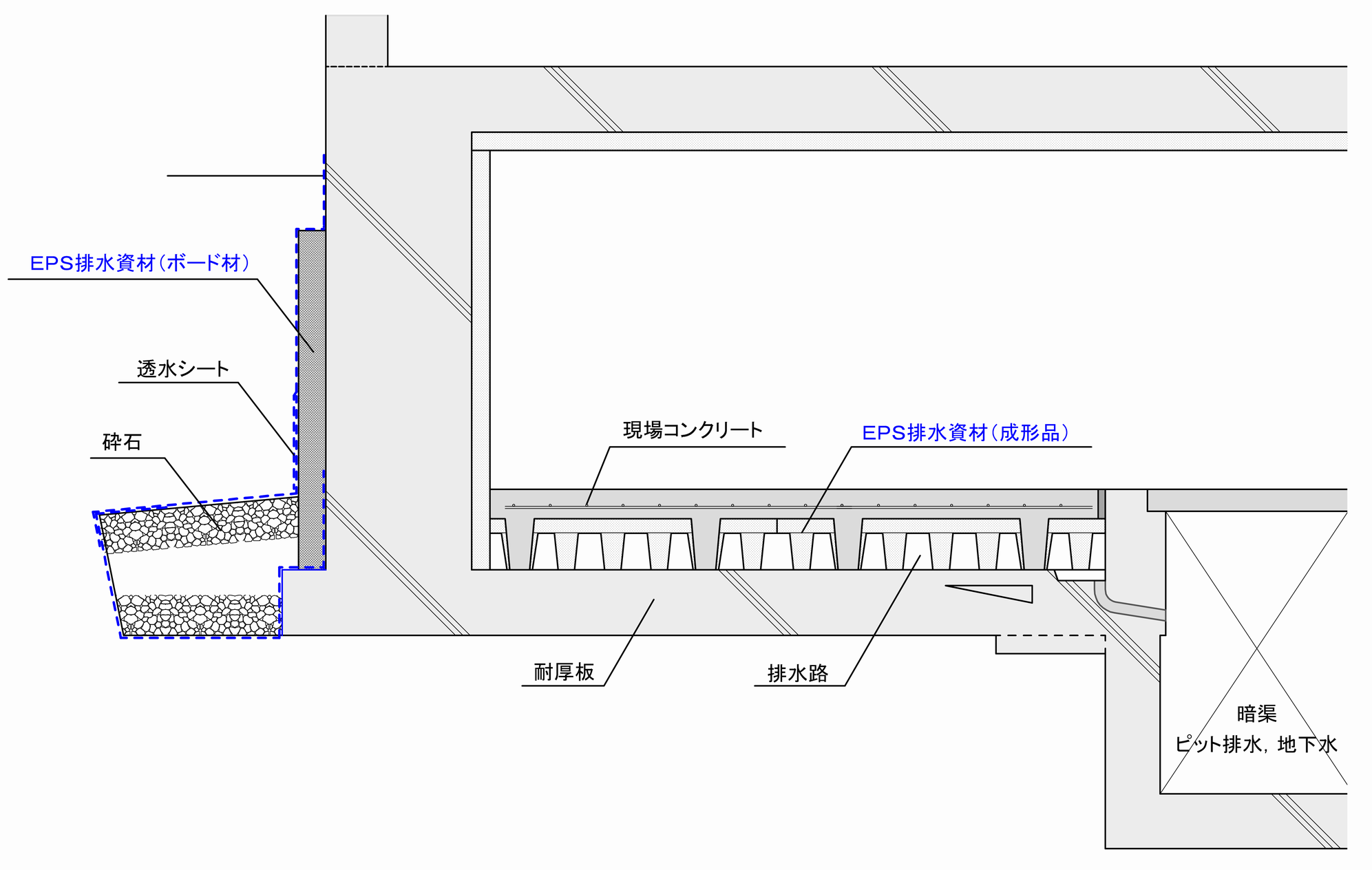 断熱機能を兼ね備えた EPS排水資材です。 透水性に特化し,特殊形状のビーズで成形したものや 発泡ビーズを樹脂で成形したものがあります。