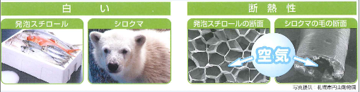コメント:お互いに「白い」というだけでなく、シロクマの毛と発泡スチロールには、どちらも「空気」が入った構造から優れた断熱性(保温性・保冷性)を持つという共通点があります。